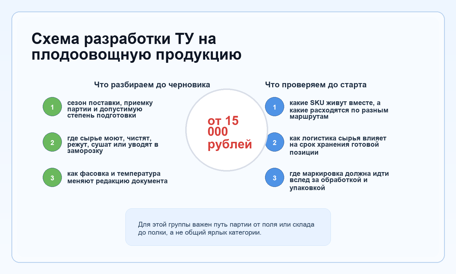 По плодоовощной продукции бесполезно начинать от общего списка культур. Для документа важнее понять, в каком состоянии сырье приходит на площадку и какой путь проходит дальше: остается ли товар свежим, идет ли на мойку и калибровку, уходит ли в резку, сушку, шоковую заморозку или собирается в фасованный набор. Именно с этого момента определяется будущая редакция технических условий.