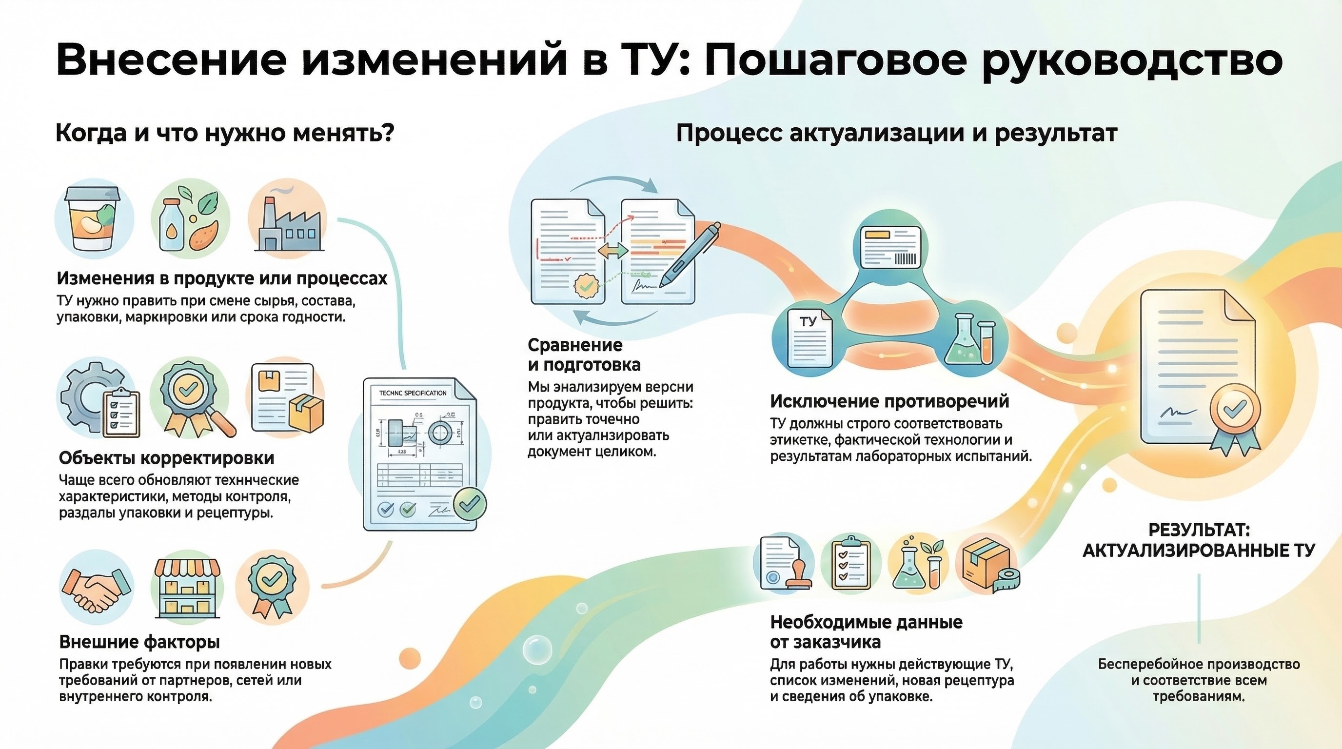 Если продукция изменилась, старые ТУ должны отражать фактический состав, технологию и комплект сопроводительной документации. Иначе документ перестает работать как опора для производства и начинает создавать противоречия между ТУ, маркировкой и реальным продуктом.